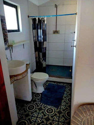 1 bathroom with shower, basin and toilet inside and an additional bathroom outside offering the same.